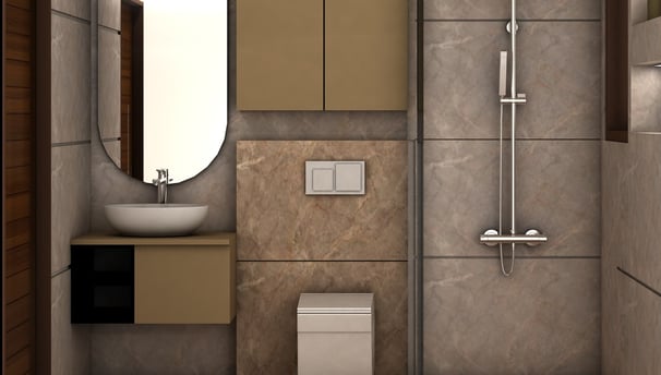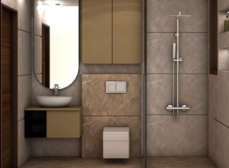 A modern, elegant bathroom with stylish fittings, premium tiles, and soft lighting for a luxurious feel.